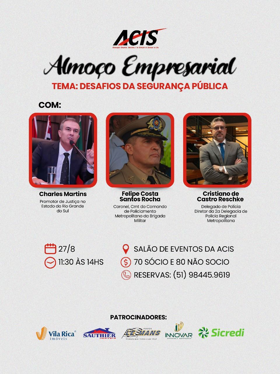 O Almoço Empresarial da Associação Comercial Industrial e de Serviços (ACIS) de Sapucaia do Sul, do mês de agosto, ocorre na quarta-feira, dia 27, a partir das 11h30, com o painel Desafios da Segurança Pública, com as seguintes participações: Felipe Costa Santos Rocha (Coronel, Comandante de Policiamento Metropolitano da Brigada Militar); Cristiano de Castro Reschke (Delegado de Polícia da 2ª Delegacia de Polícia Regional Metropolitana); Charles Martins (Promotor de Justiça no Estado do Rio Grande do Sul). De acordo com o presidente da ACIS, Douglas Santin, a entidade estará oportunizando aos associados a apresentação de mais um tema de interesse da classe empresarial do Município O encontro será no Salão de Eventos da ACIS (Rua Capitão Camboim 32, 11° andar) e os ingressos podem ser adquiridos na secretaria da entidade pelos seguintes valores: R$ 70,00 (associados) e R$ 80,00 (não associados). Reservas pelo fone: 98445-9619. Patrocinadores: Sicredi, Sauthier Imóveis, Innovar Assessoria Empresarial, Postos Le Mans; Vila Rica Imóveis.